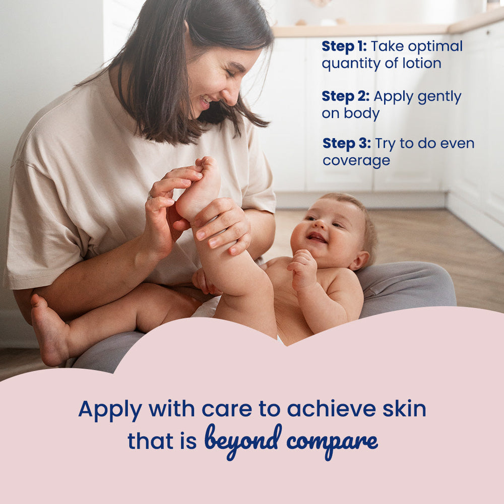 - Take the appropriate amount of lotion in your hand and gently apply it all over your baby's body to smoothen their skin