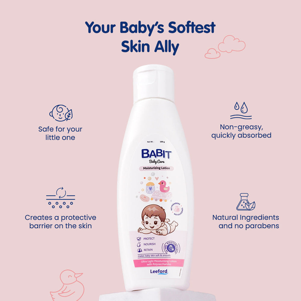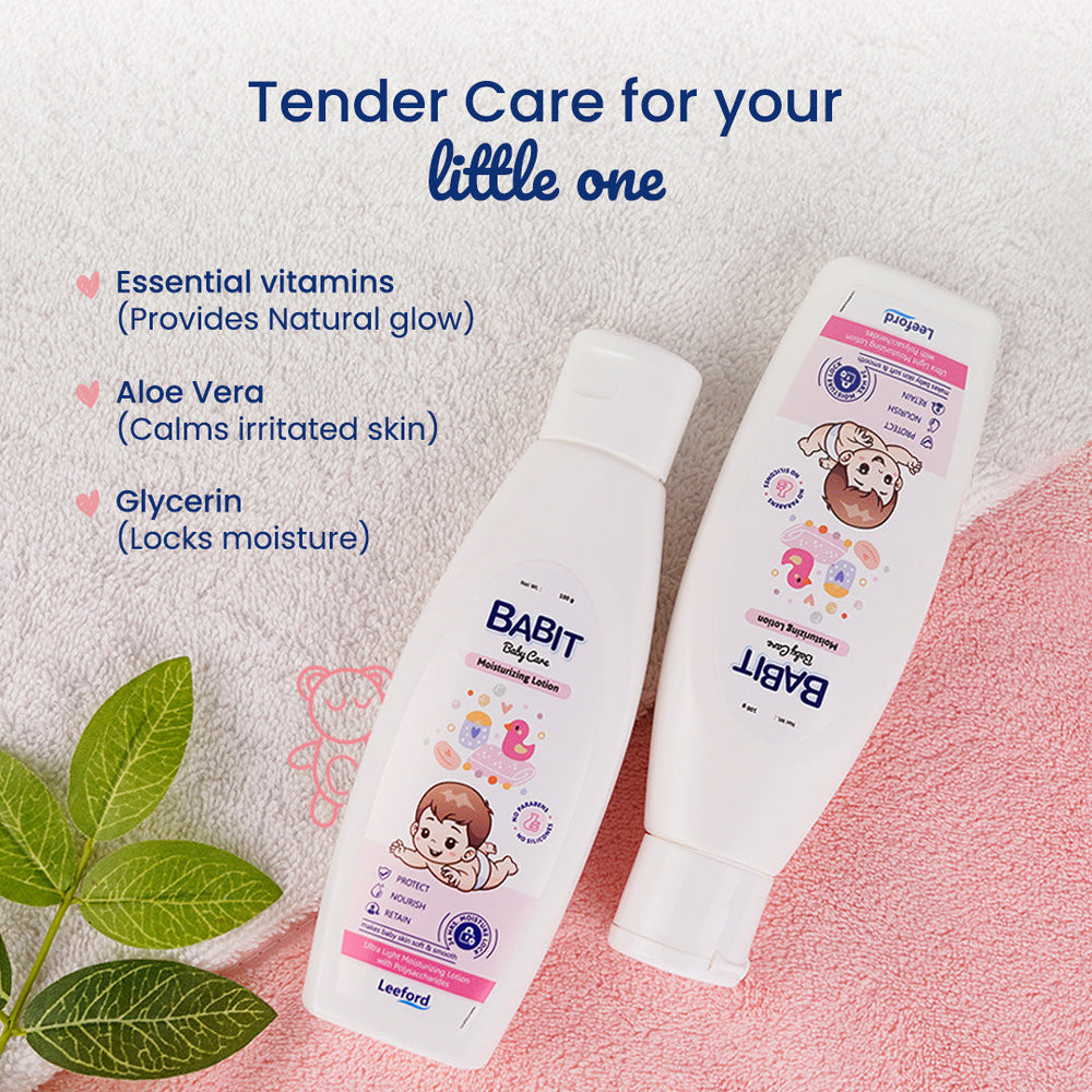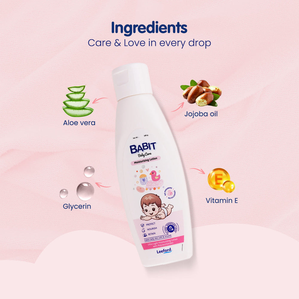 Babit baby lotion is enriched with natural Aloe Vera, known for its soothing qualities, and vitamin E, a natural skin conditioner. It's gentle & safe for newborns, it's non-greasy quick absorb formula locks in moisture that lasts up to 24 hrs. This lotion treats itchy, chapped, irritated, dry skin & prevents moisture loss for soft & smooth skin and keeps the baby’s delicate skin healthy & protected.