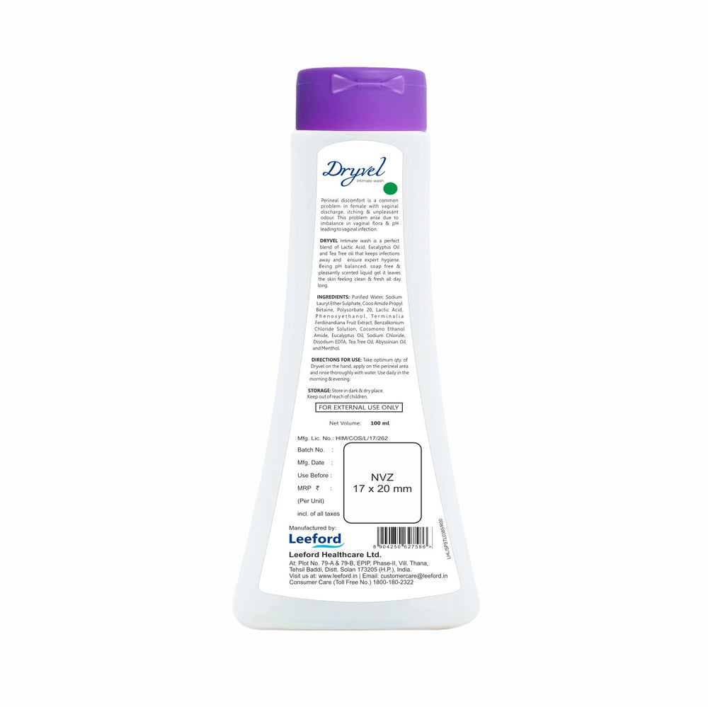 DRYVEL Intimate wash is a perfect blend of Lactic Acid, Eucalyptus Oil, and Tea Tree oil that keeps infections away and ensures expert hygiene. Being pH-balanced, soap-free & pleasantly scented liquid gel it leaves the skin feeling clean & fresh all day long.