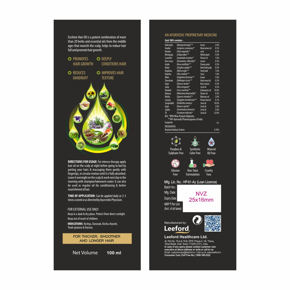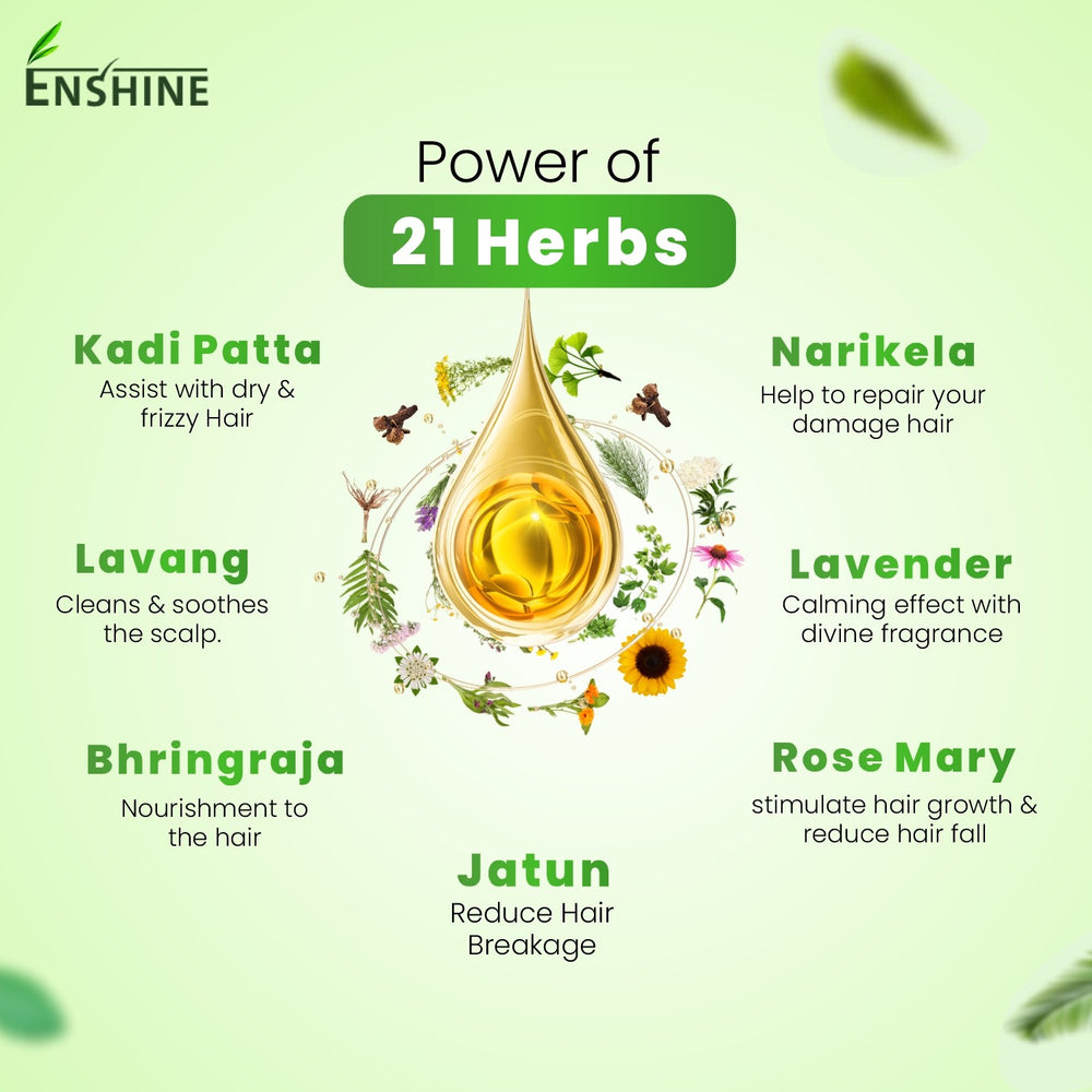 Enshine Medicated Hair Oil-: Hair loss is a condition that is more fearful then ill health, thought of losing lustrous hair is frightening, especially as we age. Enshine Medicated Herbal Hair oil is an elixir of 21 herbs & oils that addresses over all hair issues to provide you healthy, lustrous, long & shiny hair. Enrich hair from root to tip with Enshine’s Herbal Hair Oil, the non sticky, nourishing & styling hair oil which is infused with rich concentration of herbs in natural oils, Enshine nourish dry, damaged & unmanageable hair, making them shiny, dense and silky smooth. The light non sticky formula evenly distributes throughout your strands to give thickness, restrains hair fall and imparts shine & life to hair.