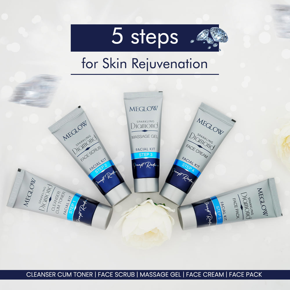 - Face Scrub: Take a small amount of Meglow Sparkling Diamond Scrub provided in the facial Kit and apply it evenly on your damp face. Gently massage in circular motions for about 3-5 minutes, focusing on areas prone to blackheads or dullness. Rinse off with water and pat dry.